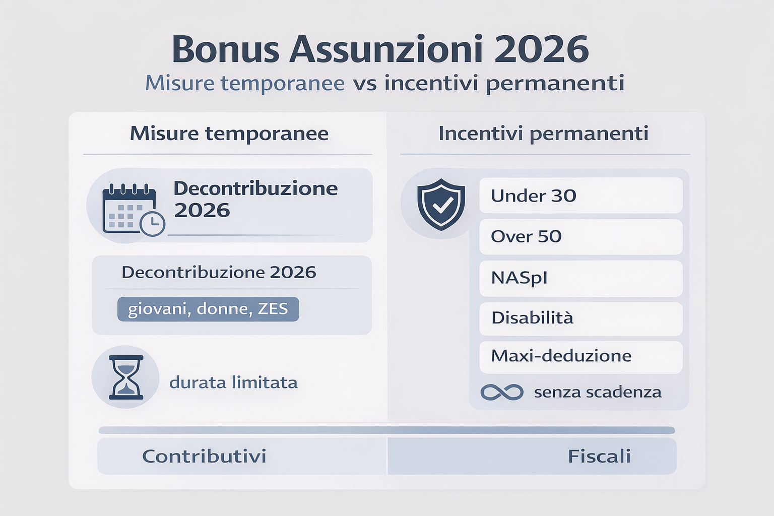 Accanto agli interventi annuali, nel 2026 continuano a produrre effetti gli sgravi sulle assunzioni 2026 di natura strutturale, che non dipendono da rifinanziamenti episodici. Si tratta di misure già integrate nelle politiche del lavoro delle PMI e fondate su presupposti normativi consolidati.